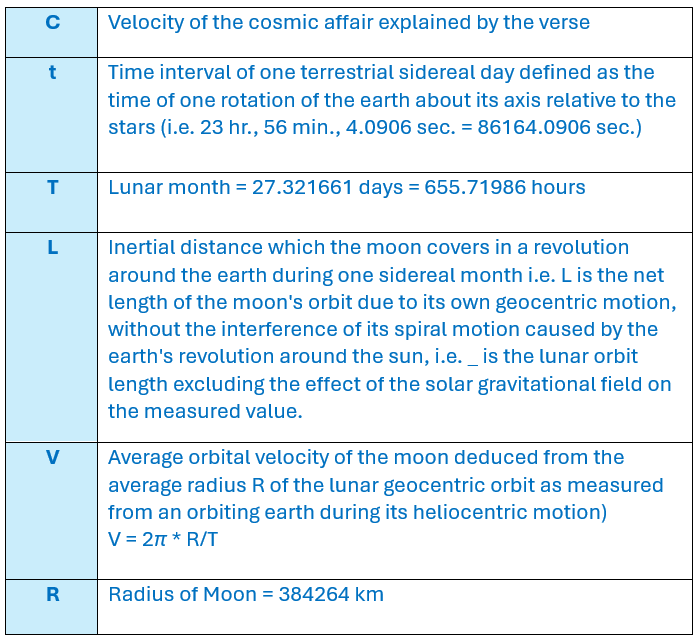 substituting the sidereal values of the periods t and T, the NASA value of the measured orbital lunar velocity V = 3682.07 km/hr., and the calculated value of cos β = cos 26.92848 = 0.89157, we get the velocity of the cosmic affair that is referred to in the Holy Qur’an.